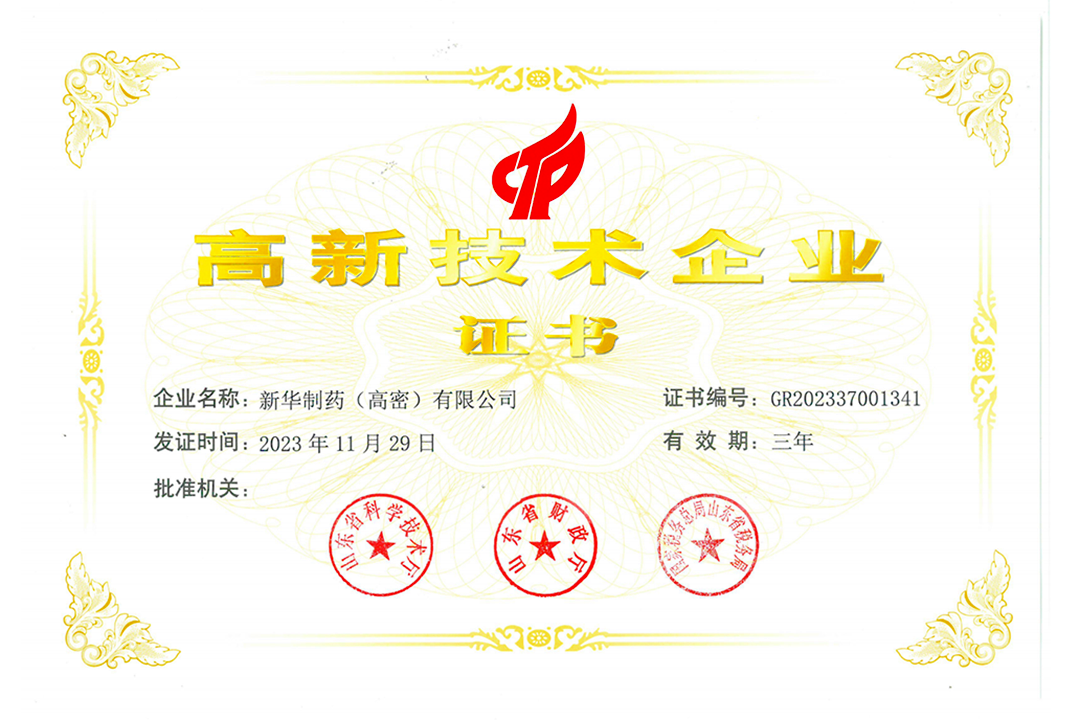 新华制药(高密)有限公司一直致力于产品研发和技术创新,此次通过高新技术企业的认定,是对公司科技创新实力的认可,对提升企业形象,助力市场推广,提升品牌影响力具有重大意义,更为公司高质量发展奠定了良好的基础。我们也将以此为契机,继续秉持自主开发、产学研结合的模式,全面提升科技创新能力,加快研发成果转换,积极履行社会责任,为推动国家医药行业高质量发展和全民健康福祉作出新的更大贡献!